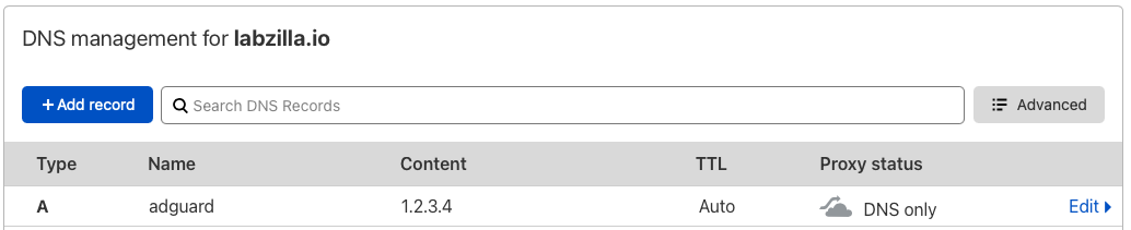 Log in to your domain registrar, and configure a new DNS record to point to your server’s IP address. If you have an IPv6 address, don’t forget to create an AAAA record as well. If you’re using Cloudflare, make sure that their proxying is turned off.