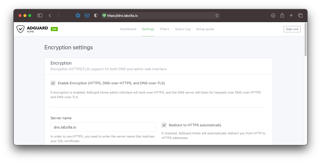 Now that AdGuard Home is running, we need to configure it to use the SSL certificate we requested from Let’s Encrypt.