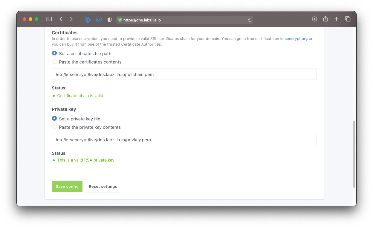 /etc/letsencrypt/live/dns.labzilla.io/fullchain.pemand/etc/letsencrypt/live/dns.labzilla.io/privkey.pem) respectively.