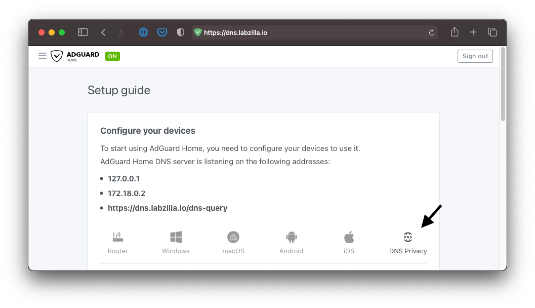 - In the AdGuard admin panel, tap Setup Guide, and then tap DNS Privacy.