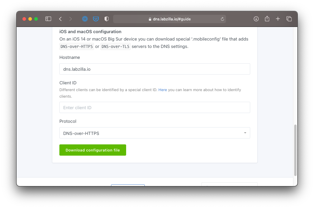 - At the bottom of the page, under iOS and macOS Configuration, enter in the host name (dns.labzilla.io) and optionally a client ID (no spaces or symbols).
