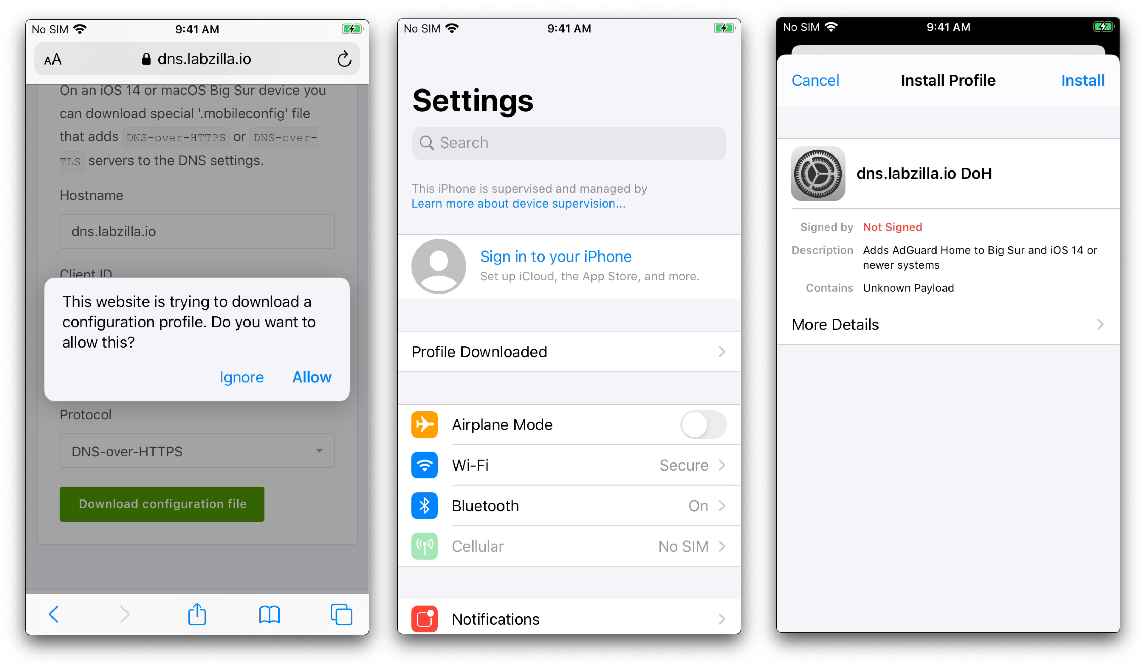 DNS over HTTPS is not configurable from within iOS settings or macOS system preferences. Instead, a mobile configuration profile is used to configure your device. AdGuard Home automatically generates a valid configuration profile with the appropriate settings. AdGuard Home’s website is mobile friendly, so it’s actually easiest to complete this step right from your iOS device. Alternatively, you can download the mobile configuration profile on your macOS device, and use AirDrop to transfer it.