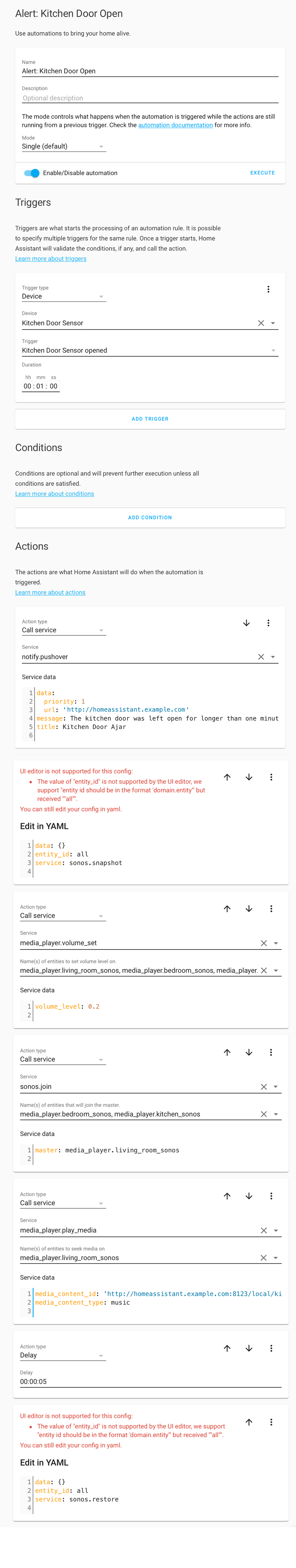 If I’m home, I usually have some music going over the Sonos system. Playing an alert chime over the Sonos will interrupt anything that’s playing (and replace the queue), which we don’t want. To get around this issue, Home Assistant can take a “snapshot” of what Sonos is playing (and at what volume) for the entire system. For Spotify, the music will resume where you left off. Unfortunately with Pandora, a new song on whatever station you were listening to will start instead.