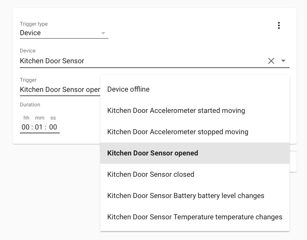 For the trigger, select Device as the type, and chose Door Sensor Opened. Specify a duration for how long the sensor needs to be in the “Open” state before firing an alert. For one minute, use 00:01:00.